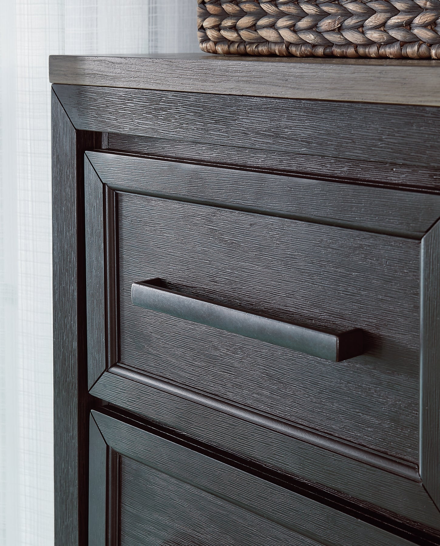 | Details | Made with hardwood solids, select oak veneers and engineered wood, Two-tone finish (brushed black and dusty grayish brown wood tone), Sleek drawer pulls with black finish, 5 soft-close, smooth-gliding drawers with fully finished interiors and dovetail construction (top drawers felt lined), 3 pull-out trays (felt lined) and 2 adjustable shelves behind door | |
